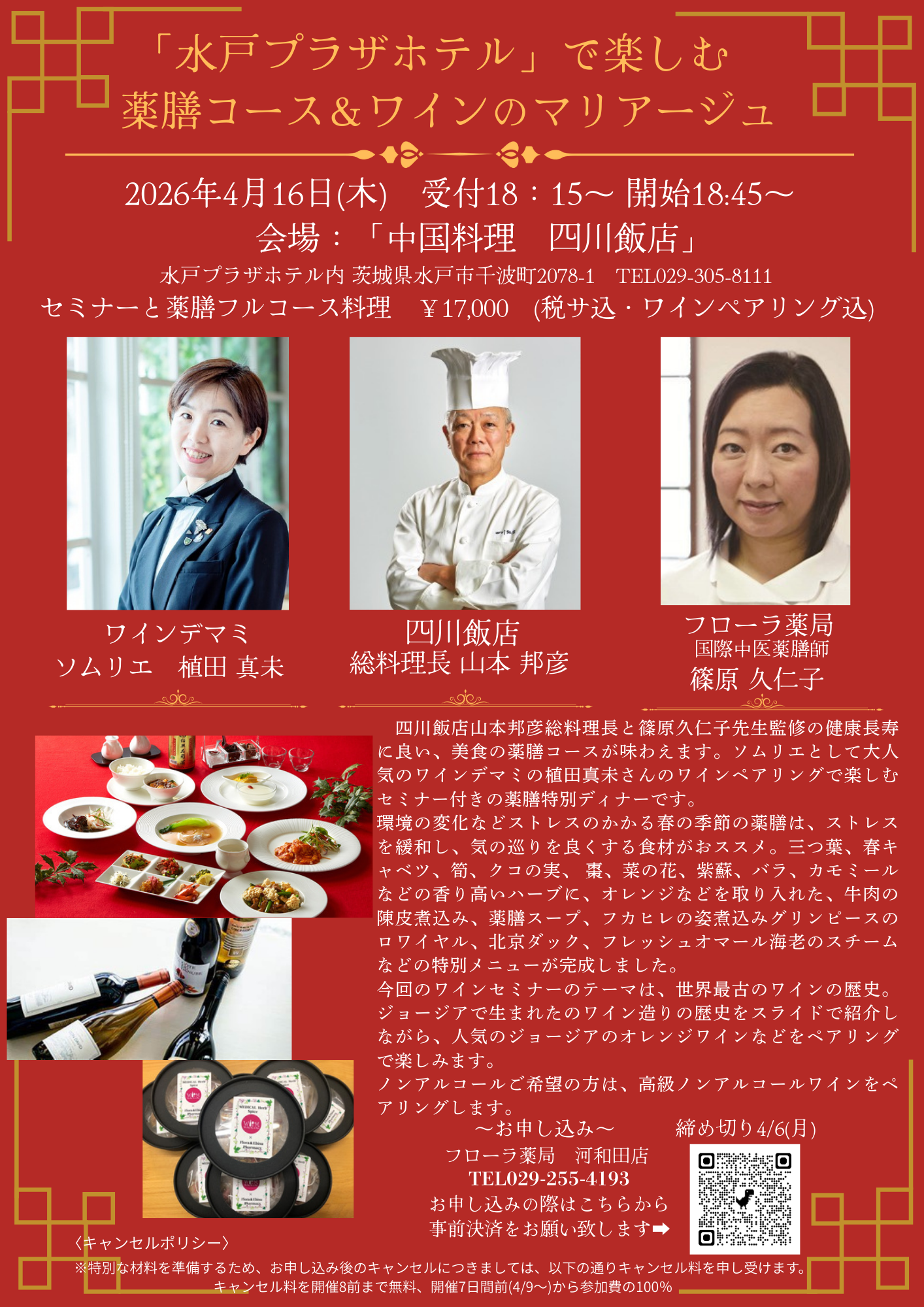 四川飯店山本邦彦総料理長と篠原久仁子先生監修の、健康長寿に良い、美食の薬膳コースが味わえます。ソムリエとして大人気のワインデマミの植田真未さんのセレクトと解説によるワインペアリングで楽しむ、セミナー付きの薬膳特別ディナーです。