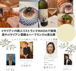 イタリアンの鉄人リストランテMASSA開催夏のイタリアン薬膳&ハーブランチ in 恵比寿 イタリアンの鉄人二代目吉田シェフと、弊社代表 篠原 久仁子がお届けする、 夏のイタリアン薬膳コースセミナー。 薬膳解説、白百合醸造のワインとイタリアンワインのペアリング付きです。お酒が飲めない方もノンアルコールのペアリングをお楽しみ頂けます。 ・日時:2026年8月2日(日) ・会場:リストランテMASSA 東京都渋谷区恵比寿1-23-22 小林鉄ビル1F ・料金、お申し込み方法は後ほど掲載致します。 お申し込みは下記までご連絡ください。 リストランテMASSA TEL 03-5793-3175