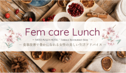 Fem care Lunch-食事改善で豊かになれる女性の美しい生活アドバイスー 新しいセミナーのご案内です! フェムケアをテーマにした、薬膳による食事改善セミナーの後、薬膳と季節の食材を使った特別コースランチをお楽しみいただける会です。 ※女性の健康問題に関連する言葉で「フェミニン=女性」と「ケア=手入れ」のふたつの言葉をかけ合わせて作られた用語。 ・日時:2026年8月19日(水) ・会場、参加費の詳細は追って掲載致します。 下記へお電話にてお申し込みください。 水戸プラザホテル内 テラスホテルレストランローズ TEL.050-3503-1066